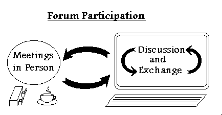 1) Overview of a Forum. If you wish to develop communication between individuals, one opportunity is the development of an Internet forum. Members are linked together through the Internet, as well as in person, in what resembles one long discussion stretched over many months. A forum establishes contacts links between individuals, informs members of considerable information and works towards creating discussion, collaboration and change. These forums also works well with a large group if individuals. The following picture describes many of the elements at work in a successful electronic forum: